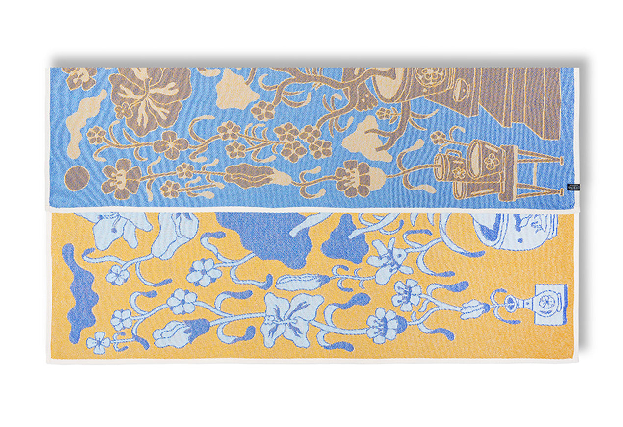 Jede Maxi XL-Decke enthält ein Originalkunstwerk aus feinen, recycelten Baumwollgarnen – detailreich, taktil und farbecht. Funktionale Kunst für Schlafzimmer und Strand.