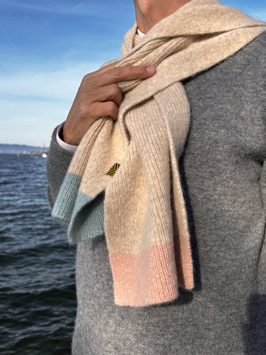 Inspirée par l'équilibre et la lumière, cette écharpe associe un beige apaisant à des bordures rose poudré et bleu ciel raffinées. Son design célèbre la simplicité et les contrastes subtils : une composition facile à porter qui illumine la saison d'une élégance naturelle.