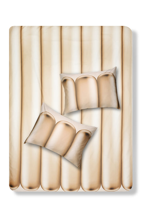 Avec Glamouflate, Luis Pons s'inspire du langage aérien des objets gonflables – des créations ludiques qui incarnent la légèreté et le mouvement de la vie moderne. De doux tubes sculpturaux ondulent à la surface, créant un rythme délicat de formes arrondies. Décliné dans des tons beiges chauds aux nuances subtiles, le design paraît aérien, vivant et immatériel. C'est une réinterprétation ludique du volume et de la douceur, transformant le lit en un paysage contemporain et flottant.