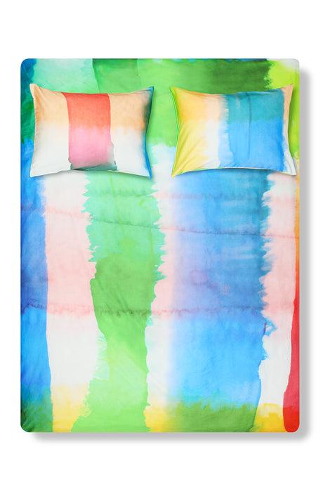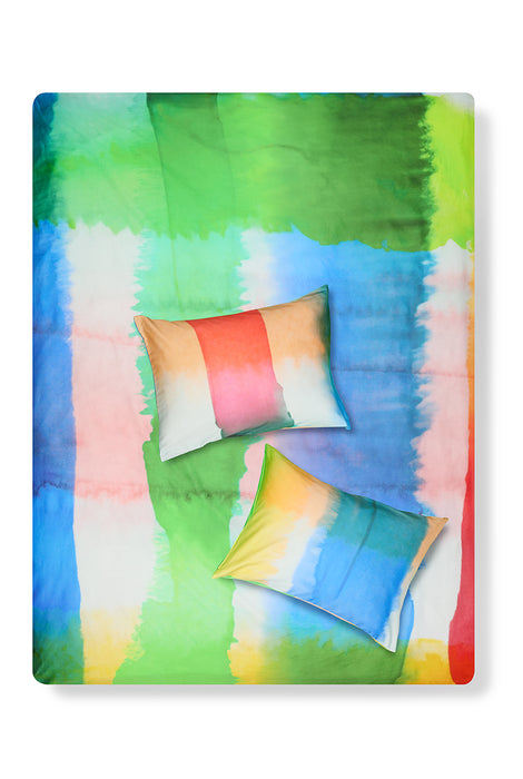 Dans Tartanic Panic, Michele Rondelli et Dario Cortese réinventent le tartan traditionnel avec une joyeuse insolence. Des bandes de couleurs s'entremêlent, se heurtent et se fondent, créant une composition électrisante où la grille se mue en un mouvement vibrant. La palette éclatante – du bleu et du vert au corail et au jaune soleil – insuffle à la création une énergie singulière. Audacieuse, spontanée et pleine de caractère, elle transforme le lit en une toile débordante d'énergie ludique.