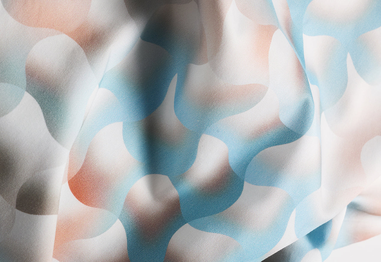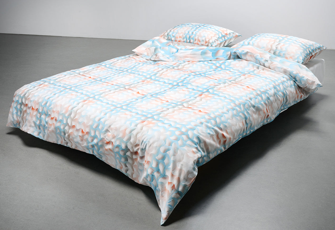Le linge de lit "Wavy Plaidy Verso" de Charlotte Gentsch adoucit le plaid classique avec des mouvements fluides et ondulatoires et de délicats dégradés de couleurs.
