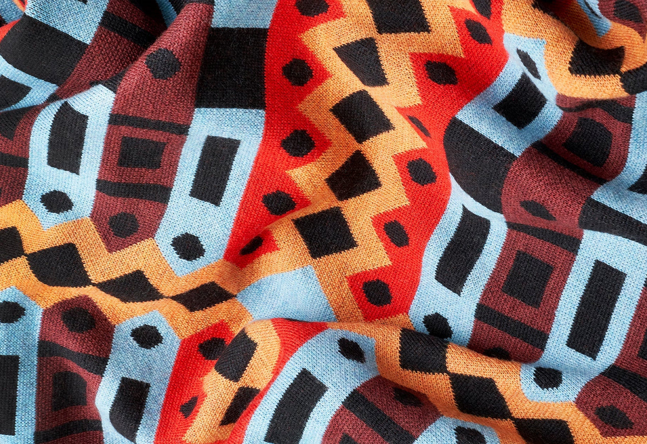 Le projet "K-Three" accentue la fascination des designers pour les façades : des rectangles empilés évoquent des kiosques fermés, des rubans en zigzag rappellent des banderoles et de minuscules portails bleus clignotent comme des enseignes au néon. La palette passe des épices chaudes aux ombres profondes, capturant le bourdonnement d'un marché de nuit juste après le crépuscule. Le tricotage tubulaire haute définition permet à chaque dent et à chaque fenêtre de rester nette, mais la surface globale ondule comme une musique lointaine. Pliez la couverture et le plan de la rue se reconfigure - preuve que, dans le plus pur esprit de Memphis, l'architecture peut danser.