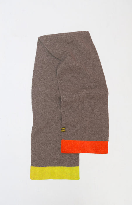 Earth Neon is a study in contrasts: a grounded cocoa-brown base interrupted by sharp flashes of colour. The vibrant orange and lime tips energise the design without overpowering its natural warmth. It is a contemporary winter accessory that balances subtlety with bold expression — a scarf that stands out while remaining effortlessly wearable.