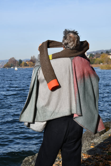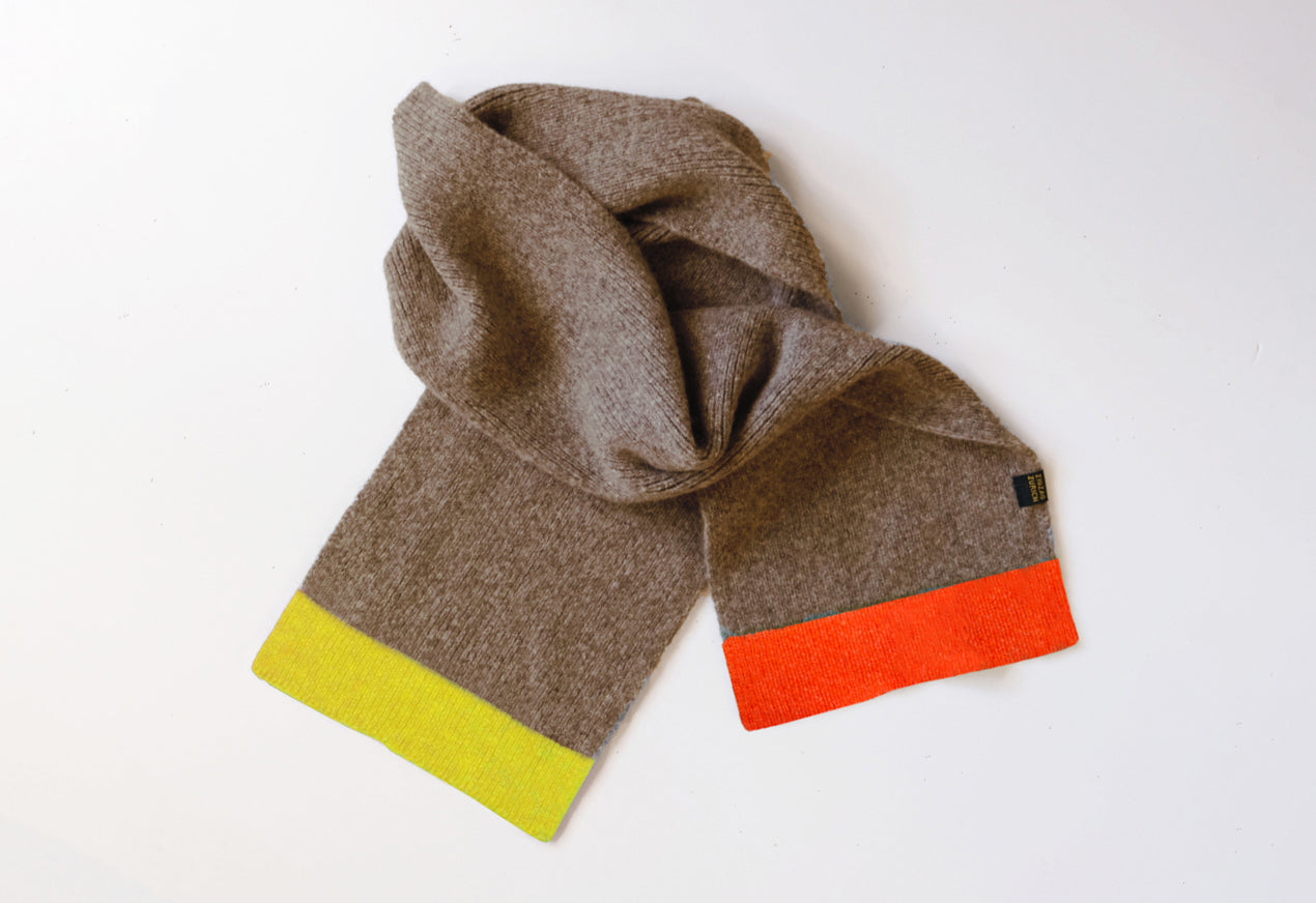 Trio Colore – Earth Neon blends deep earthy brown with vivid neon edges in orange and lime. Knitted from baby alpaca and fine merino, it brings a warm yet striking touch to winter style.