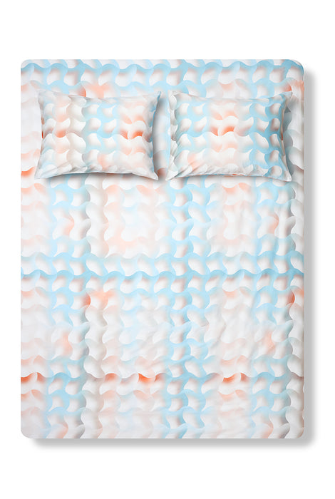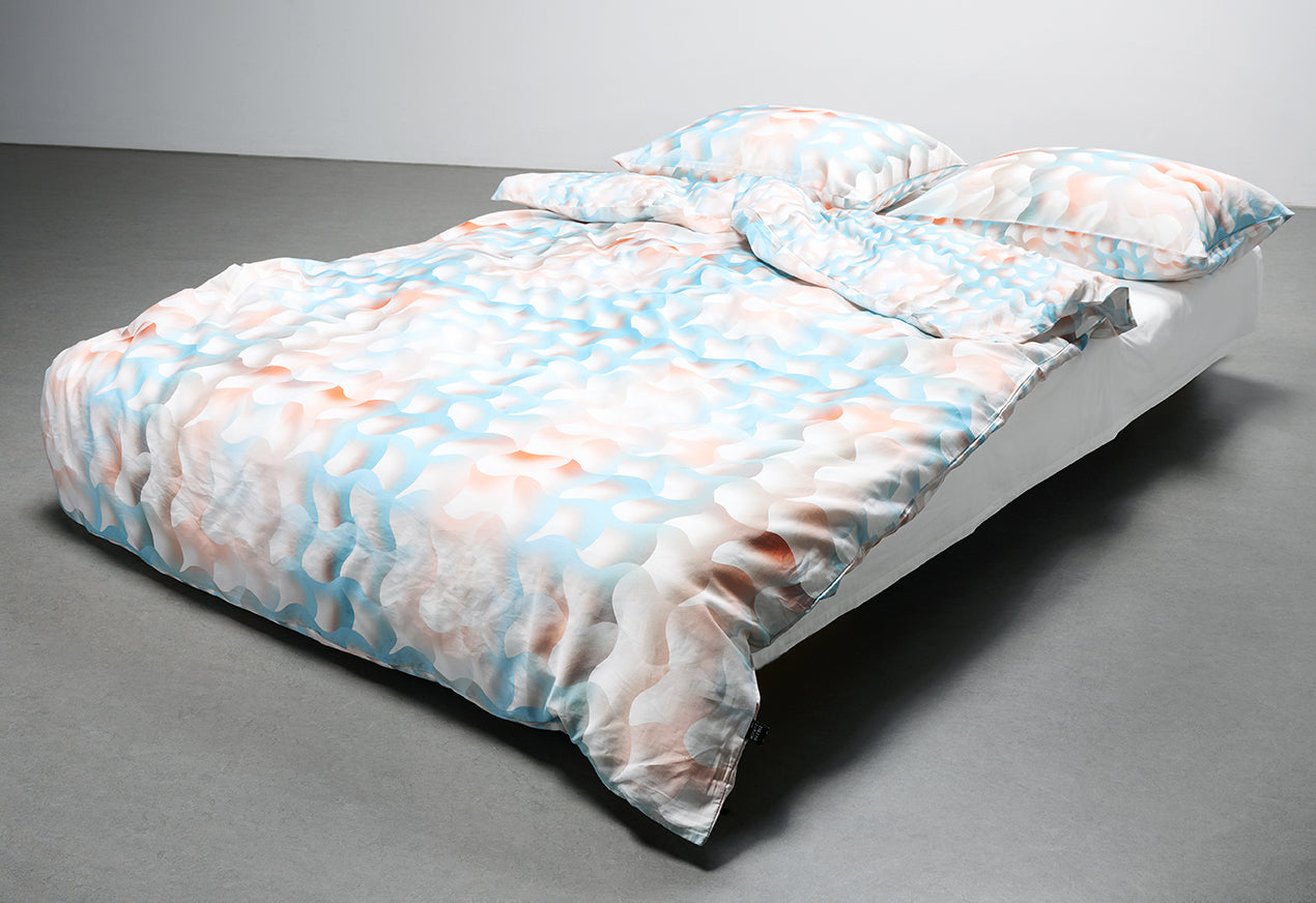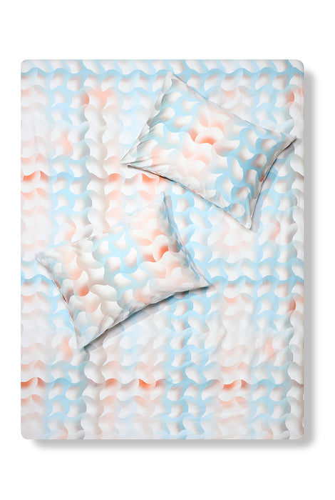 The “Wavy Plaidy Recto” bedding by Charlotte Gentsch merges tradition and movement, where classic plaid meets fluid waves in gentle, airy hues.