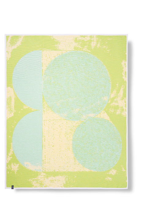 “Echolalia” by Todd Schulz explores repetition and variation through overlapping circular forms. Subtle shifts in alignment and layered textures create depth within a color-saturated composition. A cotton blanket that balances precision and imperfection with calm visual rhythm.