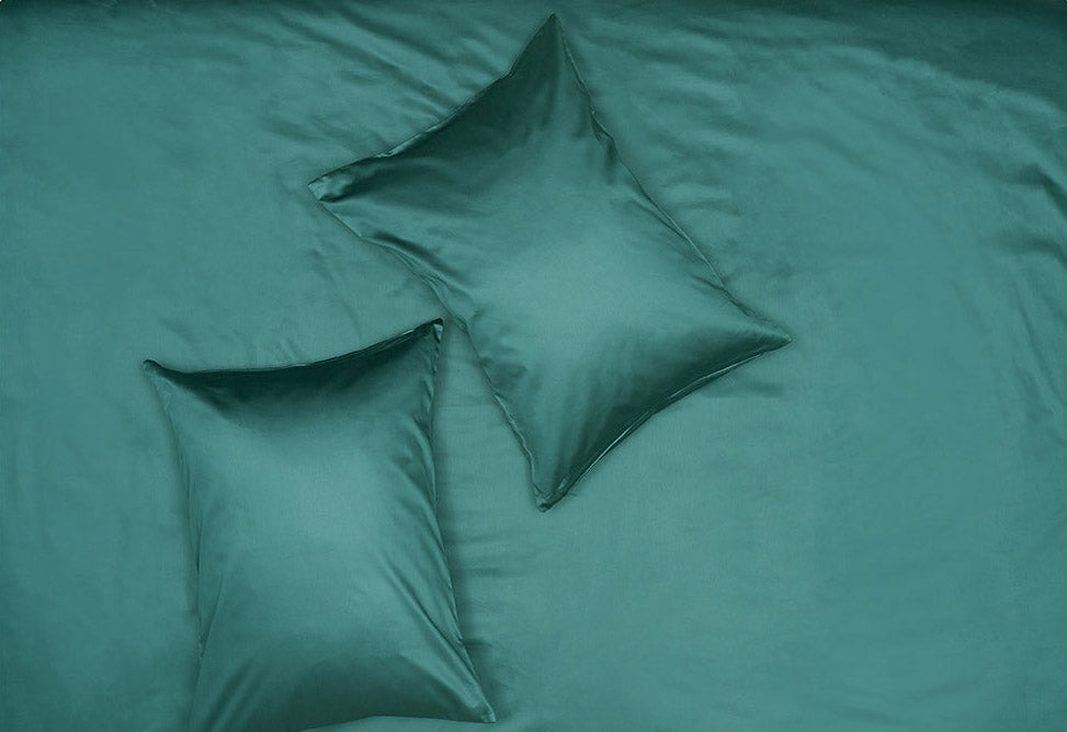 Petrol Egyptian Cotton Sateen bedding introduces a deep and sophisticated colour that blends blue and green tones with elegant depth. Crafted from long-staple Pima cotton with a smooth 300 thread count sateen weave, the fabric offers exceptional softness, breathability and a subtle satin sheen. The petrol shade creates a bold yet refined presence within modern bedroom interiors.
