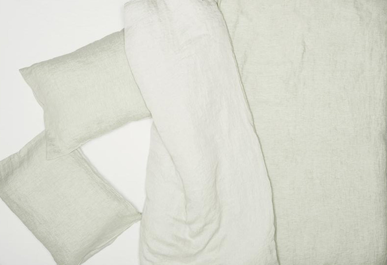 Stonewashed two-tone linen bedding in Mint and Chalk. Woven from premium yarn-dyed Belgian and Italian linen. Handcrafted in Italy for lasting comfort and style.