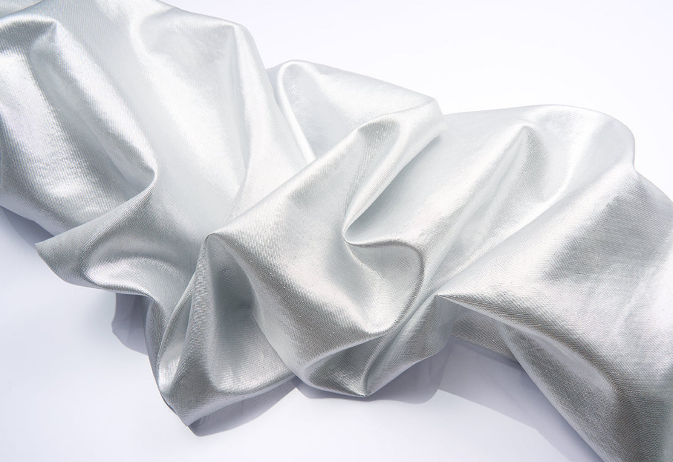 Woven in Italy from high-quality recycled polyester, this lightweight fabric weighs 43 g/m², combining advanced foil treatment with eco-conscious production to deliver both visual impact and responsible luxury.