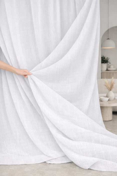 A refined semi-opaque curtain fabric woven in Italy from a balanced blend of linen and wool, designed for timeless interiors, soft texture, and everyday comfort.